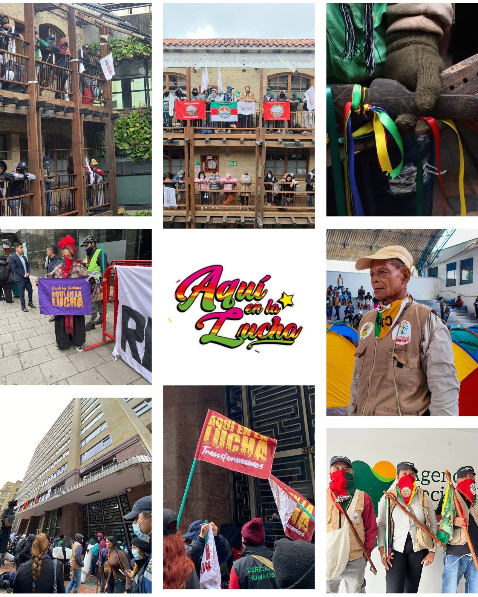 En distintos puntos de la geografía nacional y en Bogotá, los participantes de la movilización #AquíEnLaLucha realizan jornadas de exigibilidad en diferentes ministerios, unidades y direcciones, buscando que el Estado colombiano a través del gobierno actual puedan reabrir mesas de interlocución, cumplir acuerdos y actuar frente a la emergencia humanitaria que se vive en las diferentes regiones del país.