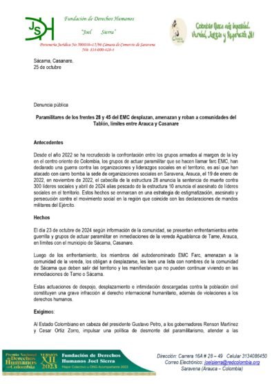 En un reciente comunicado emitido el 25 de octubre, la Fundación de Derechos Humanos Joel Sierra denunció el desplazamiento forzado y amenazas de muerte recibidas por habitantes de las comunidades de El Tablón, zona fronteriza entre Arauca y Casanare. Según la denuncia, los grupos paramilitares autodenominados frentes 28 y 45 de las FARC-EMC son responsables de estas acciones, que también incluyen actos de intimidación, despojo y violaciones a los derechos humanos.