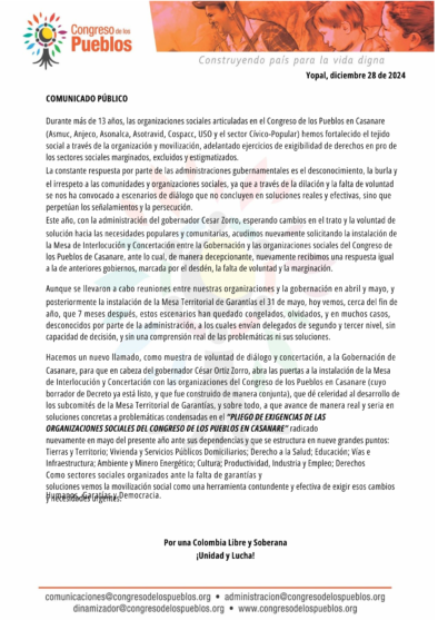 Las organizaciones sociales agrupadas en el Congreso de los Pueblos en Casanare, conformado por Asmuc, Anjeco, Asonalca, Asotravid, Cospacc, USO y el sector Cívico-Popular, han emitido un comunicado público en el que expresan su inconformidad con la gestión del gobernador Cesar Ortiz Zorro y denuncian la falta de avances en los compromisos adquiridos con estas comunidades.
